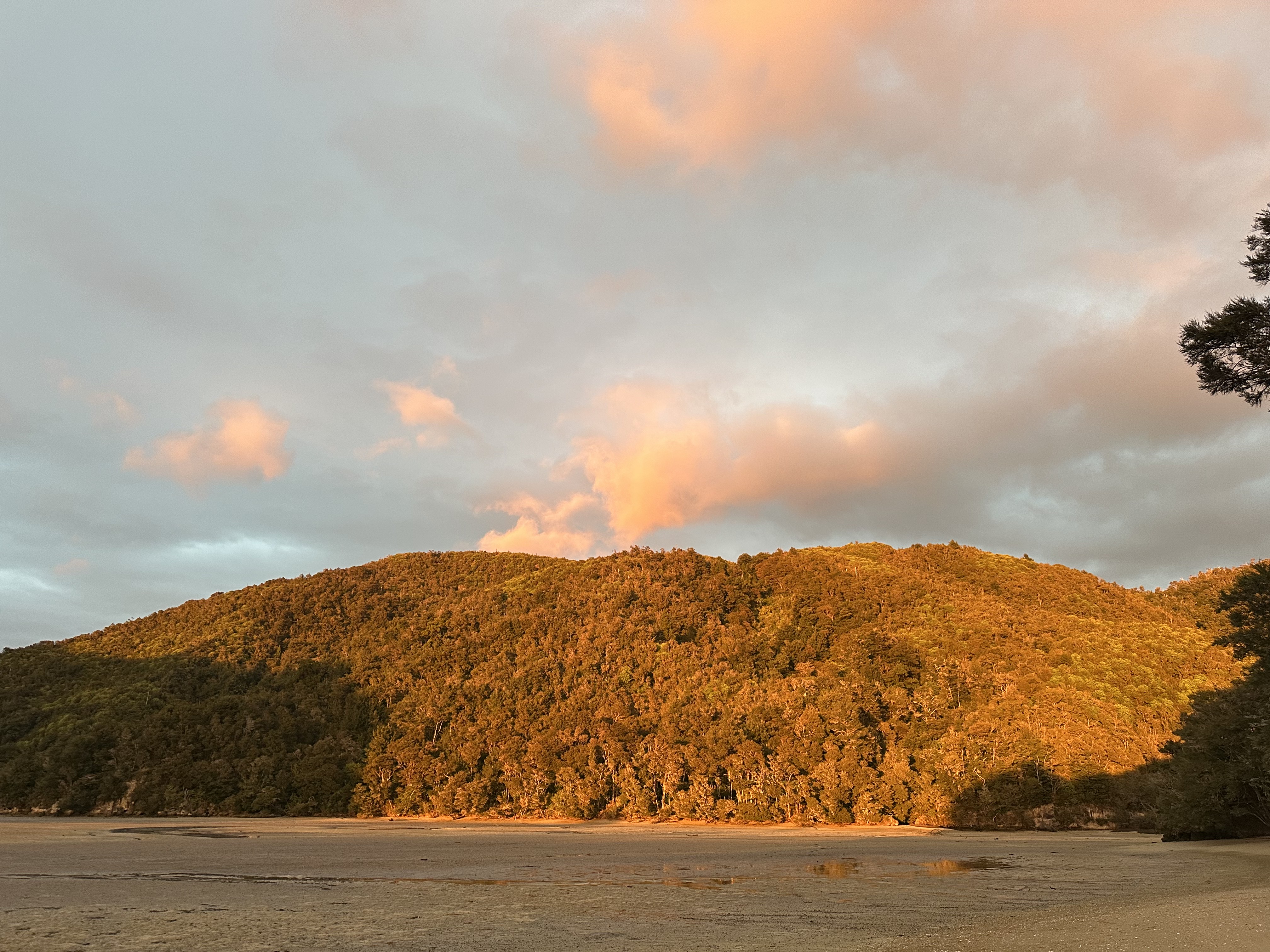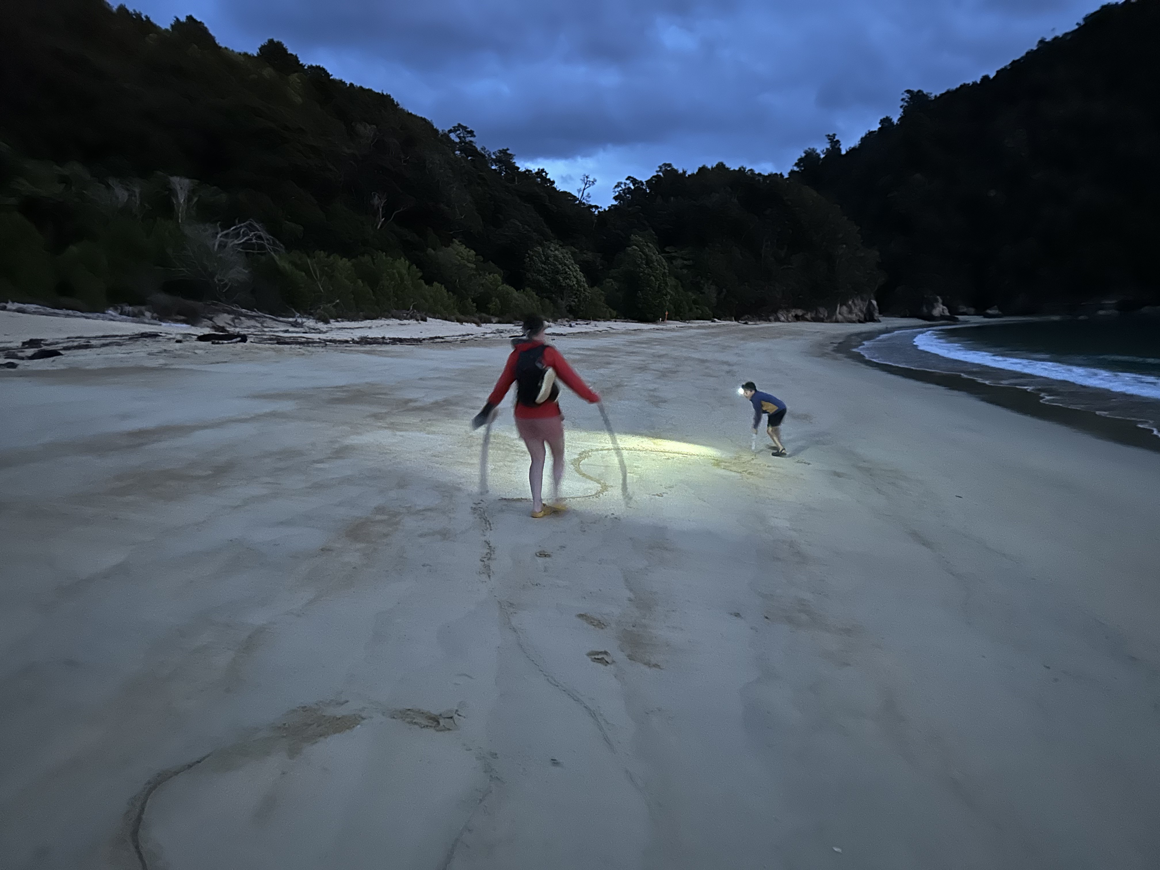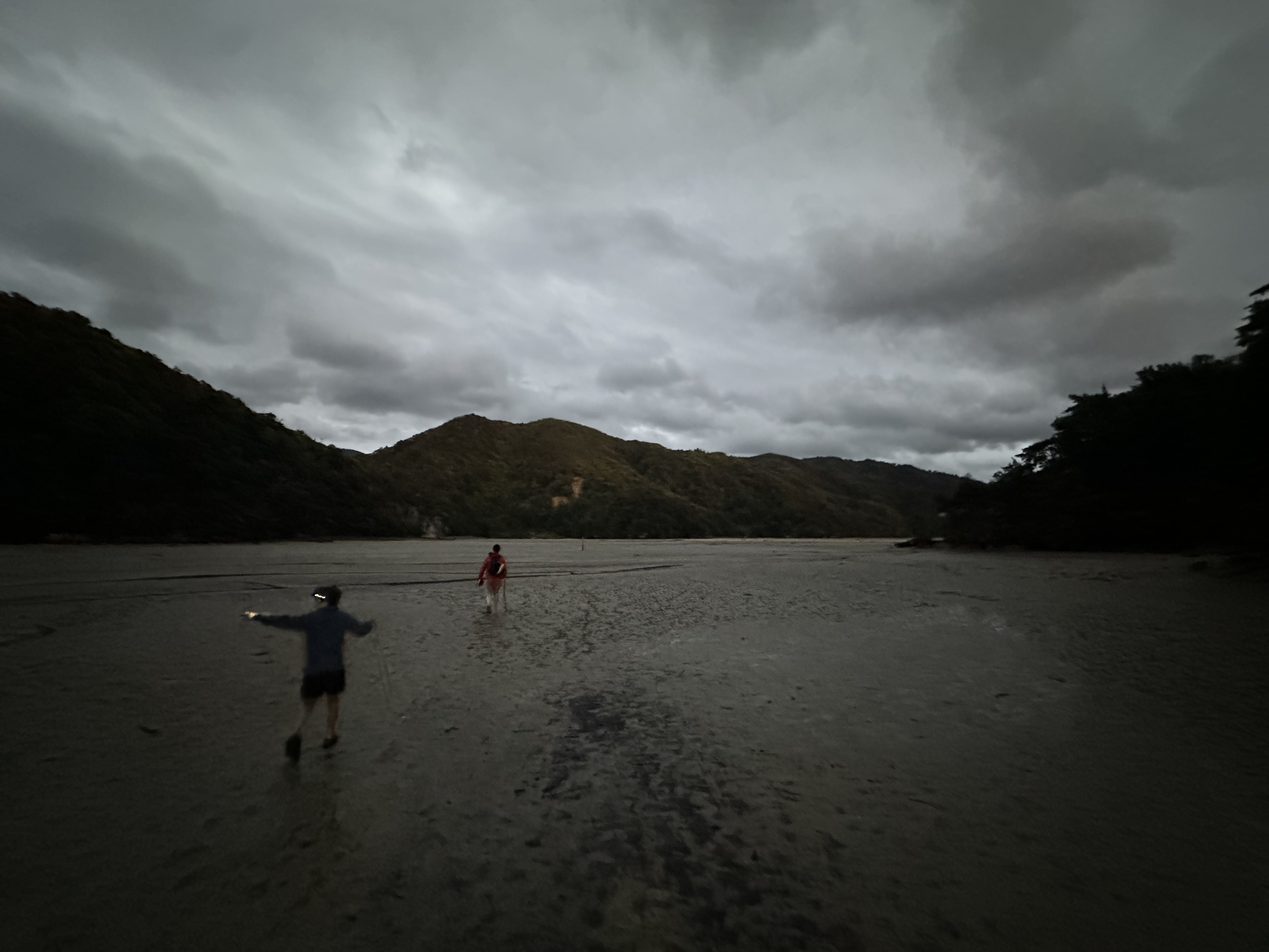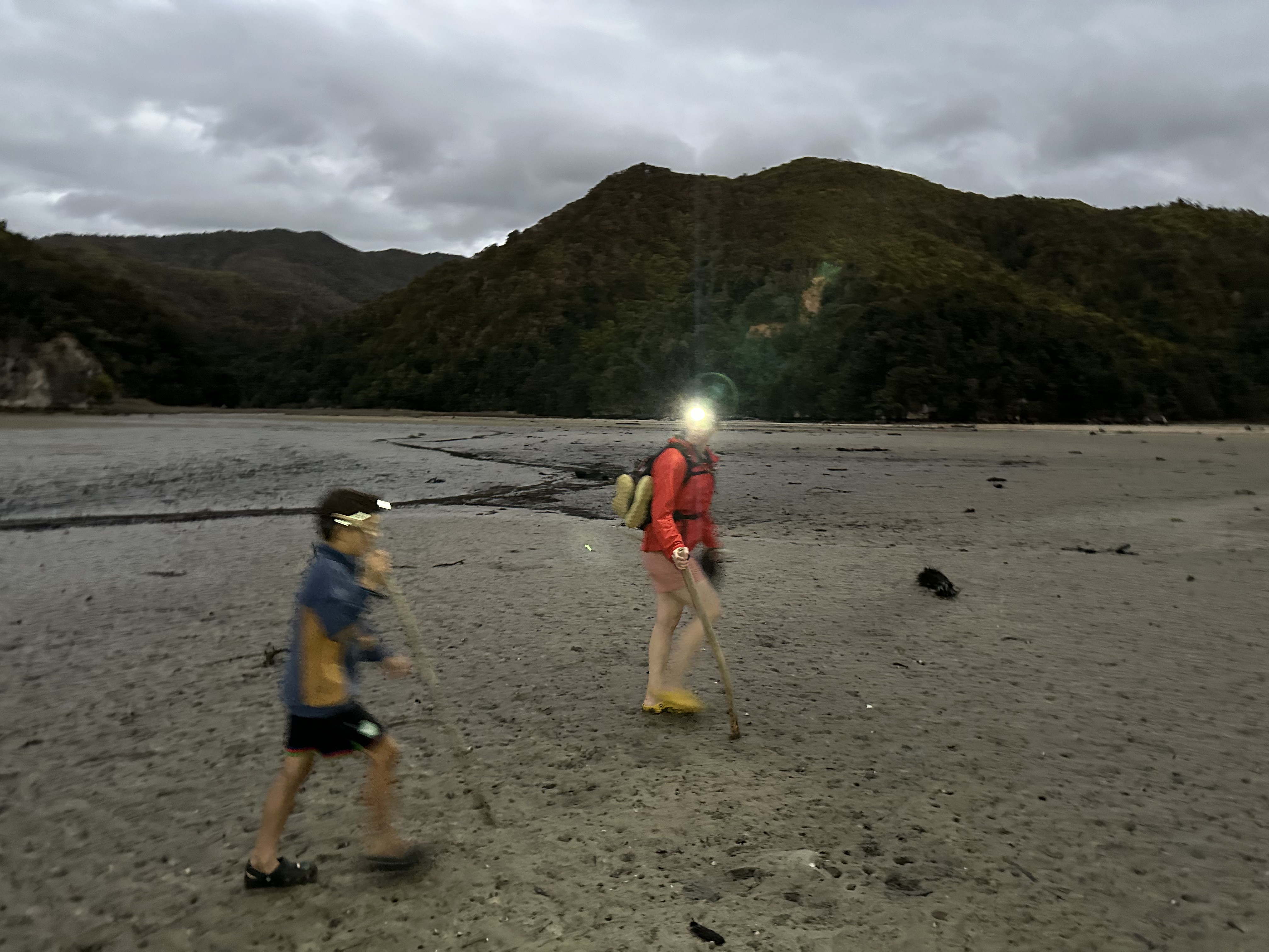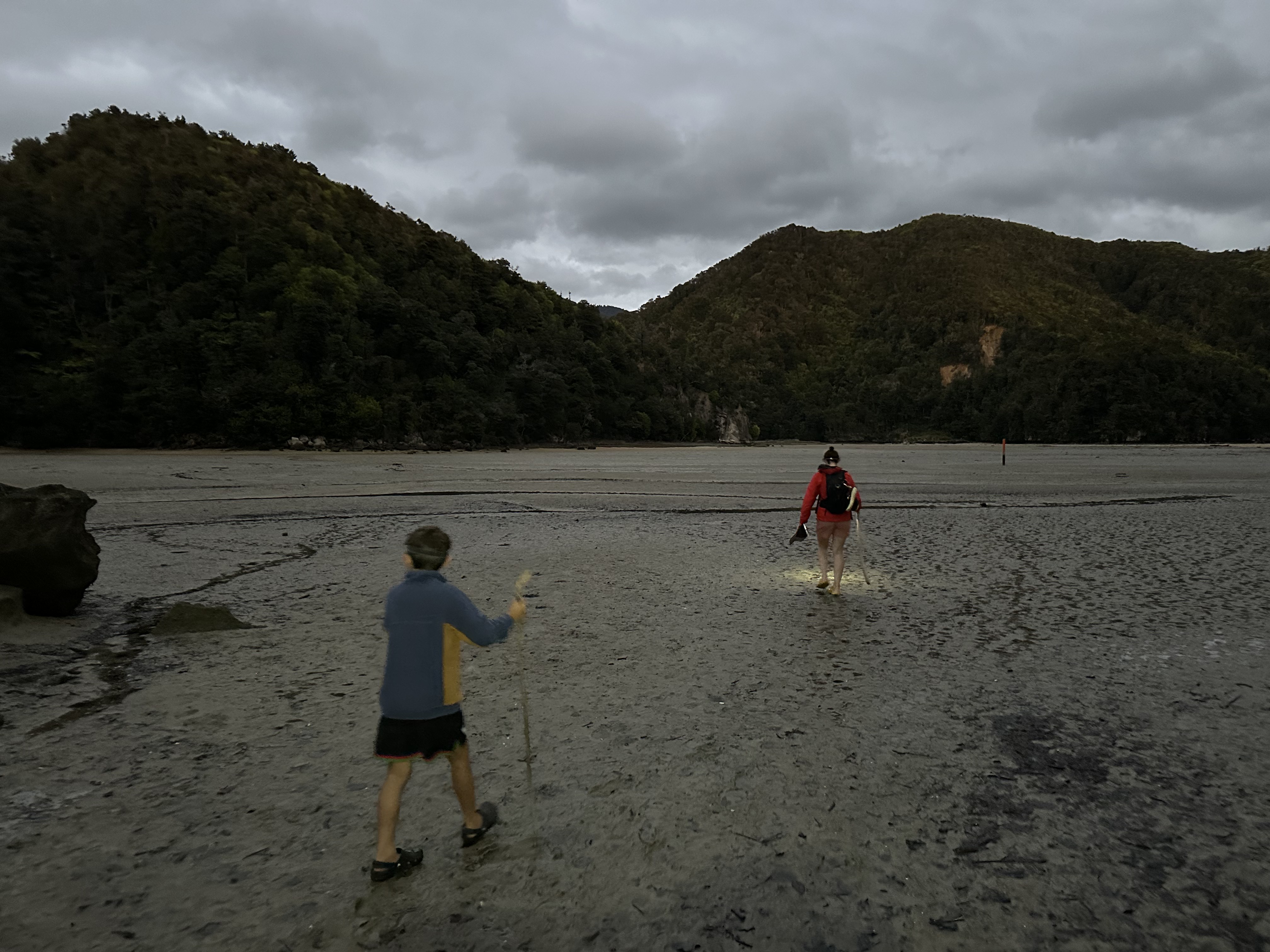 We had an early start in the dark to make our tidal crossing at low tide. Ate breakfast and tea by headlamp and then made our way to the DOC sign to drop our packs for the days Sea Shuttle. Then went to a tidal crossing as the sun came up. Oscar thought it was a bit stinky.